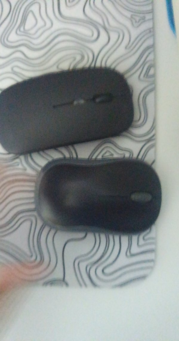 İki adet siyah kablosuz mouse, sade tasarım ve kaydırma tekerleği ile. Mat yüzeye sahip.