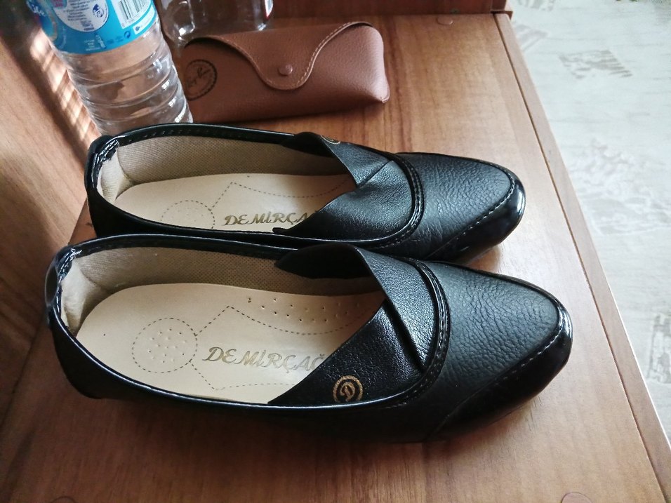 Siyah, dolgu topuklu, lastik malzemeden yapılmış ve tokalı kadın babet. Günlük kullanım için klasik ve düz tasarım. 38 numara.