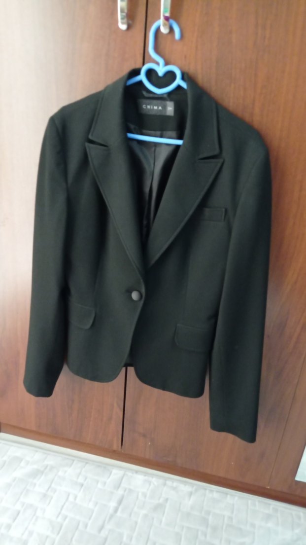 Düğmeli, koyu siyah kadın blazer ceket, klasik kesim ve notched yaka ile ofis için uygundur. Uzun kollu, midi boyda ve sentetik kumaştan üretilmiştir.