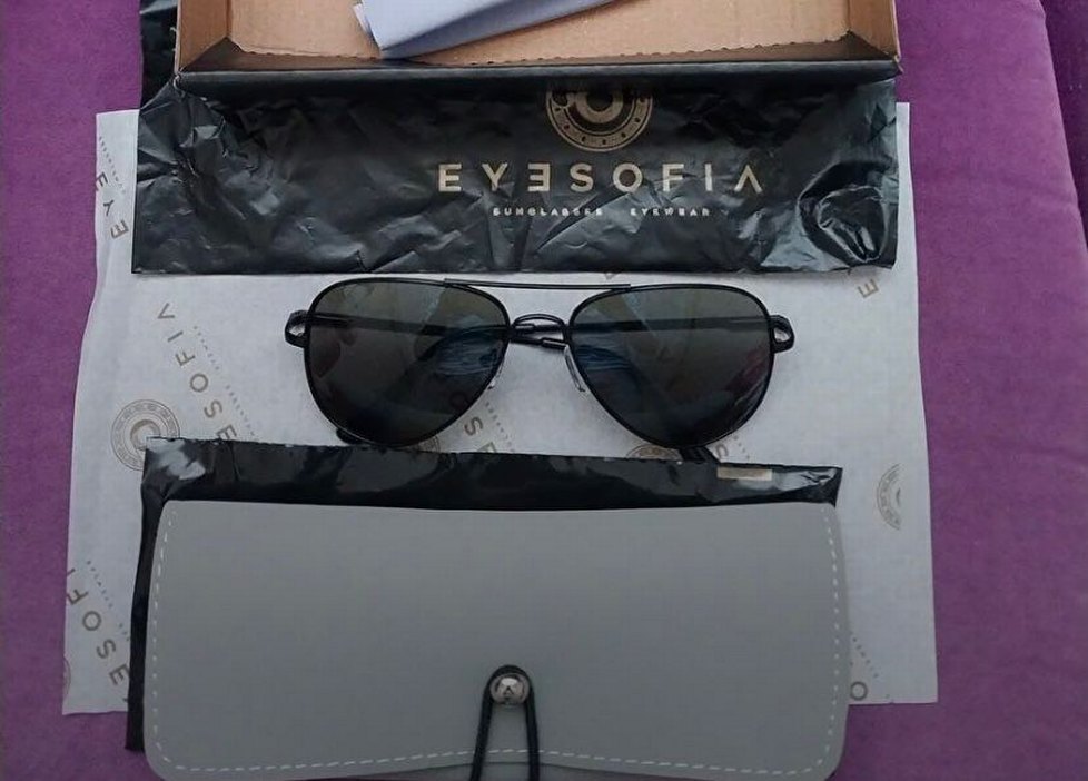 Klasik şekle sahip, tokalı çerçeveli siyah güneş gözlüğü, sade ve temel sokak stili sunar. Ambalajda 'EYESOFIA' markası yer alır. ️