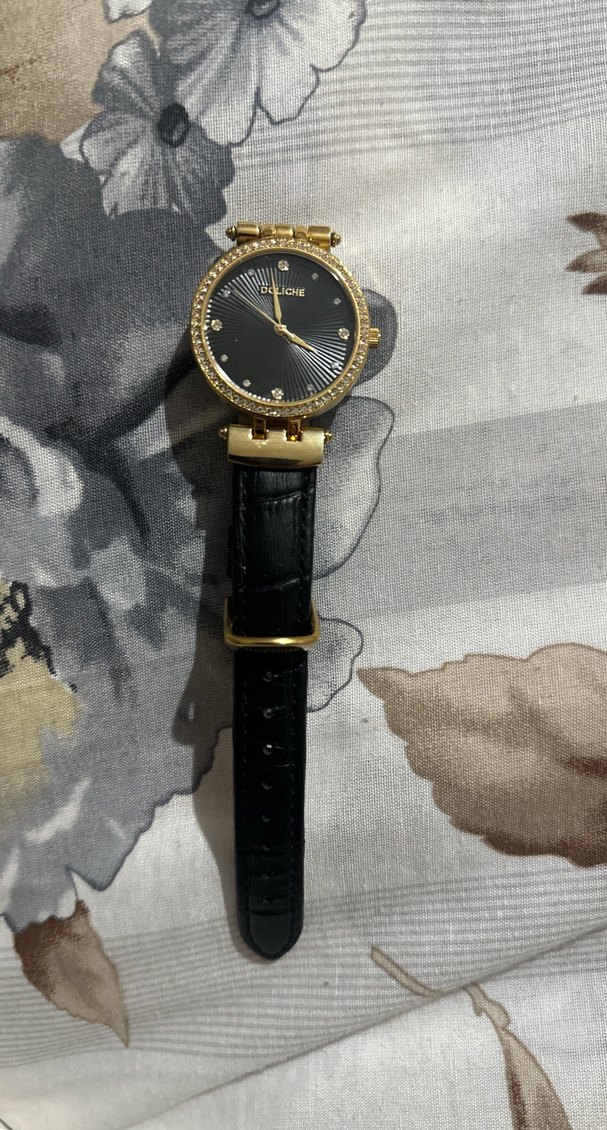 Klasik zarafette, koyu siyah deri kayışlı, tokalı, altın renkli taşlı yuvarlak kasalı kadın kol saati.️