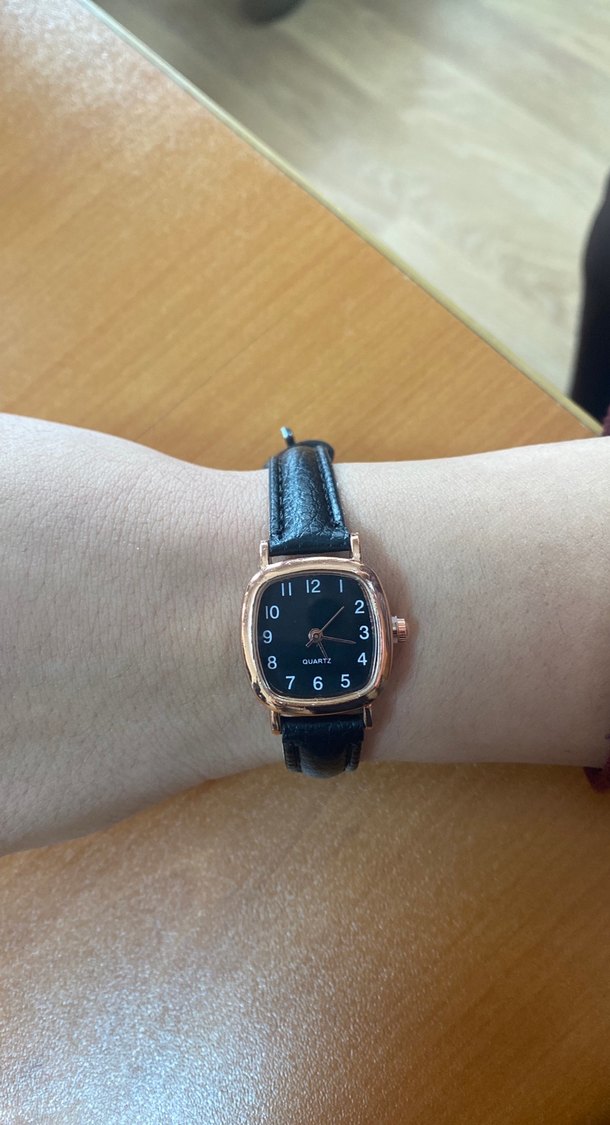 Kadınlar için siyah deri kayışlı, tokalı ve kare kadranlı klasik ve modern tarzda kol saati. Sayılar belirgin, koyu zeminli tasarım öne çıkar. ⌚
