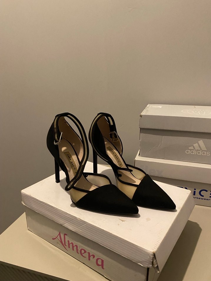 Siyah, tokalı bantlara sahip kauçuk malzemeden klasik ve çağdaş görünümlü stiletto topuklu ayakkabı. Marka: Amera.