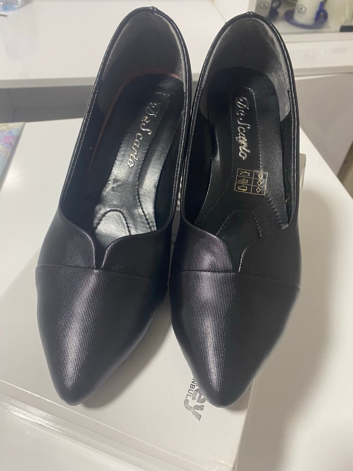 Siyah renkte, tokalı ve kauçuk malzemeden üretilmiş kadın topuklu ayakkabılar. Ofis kullanımı için uygun, klasik ve geleneksel tasarım. Çok şık ve rahat sadece bir defa giyilmiştir ve hiçbir defosu yoktur