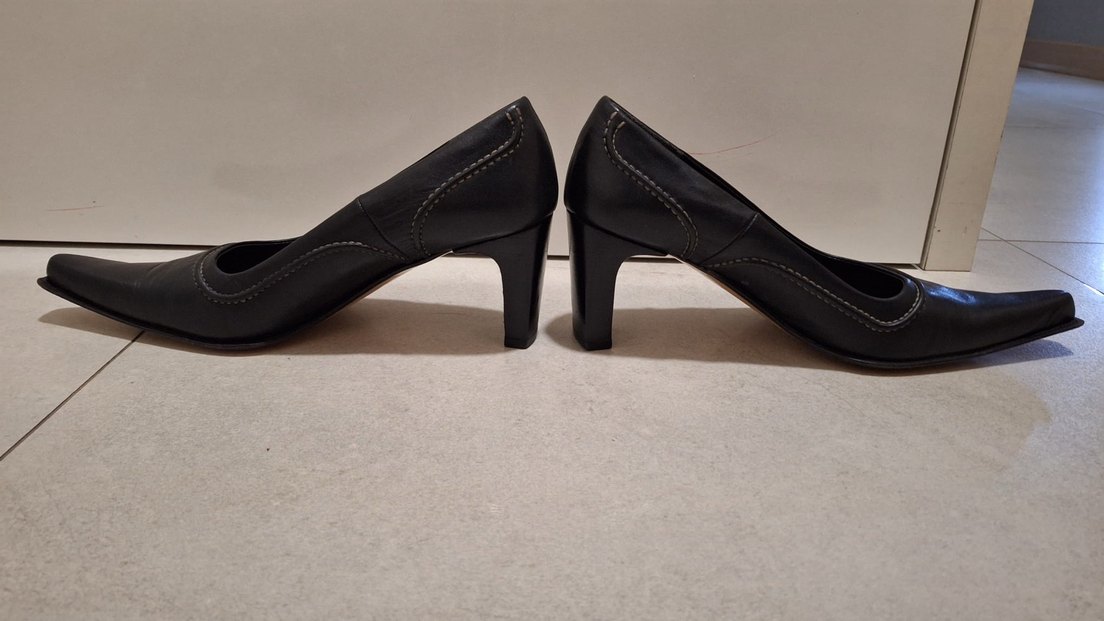 Dayanıklı kauçuk malzemeden, siyah kadın topuklu ayakkabı. Ofis için uygun, çağdaş tarzda klasik model. 40 numara .