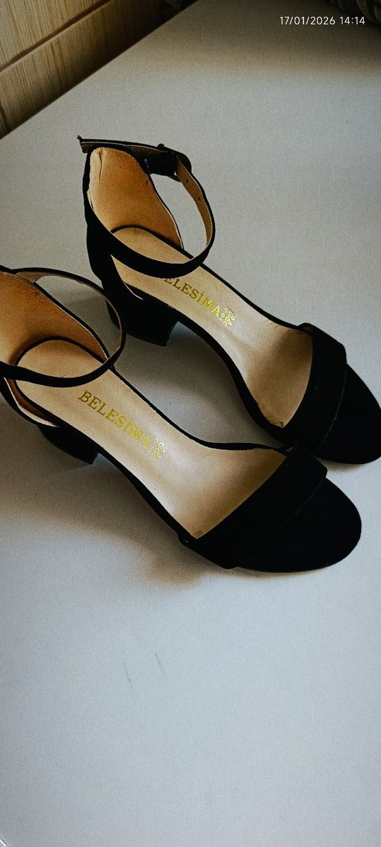 Klasik siyah topuklu sandaletler, blok topuk ve tokalı bantla, yılan derisi desenli kauçuk malzemeden yapılmıştır, romantik akşamlar için uygundur.