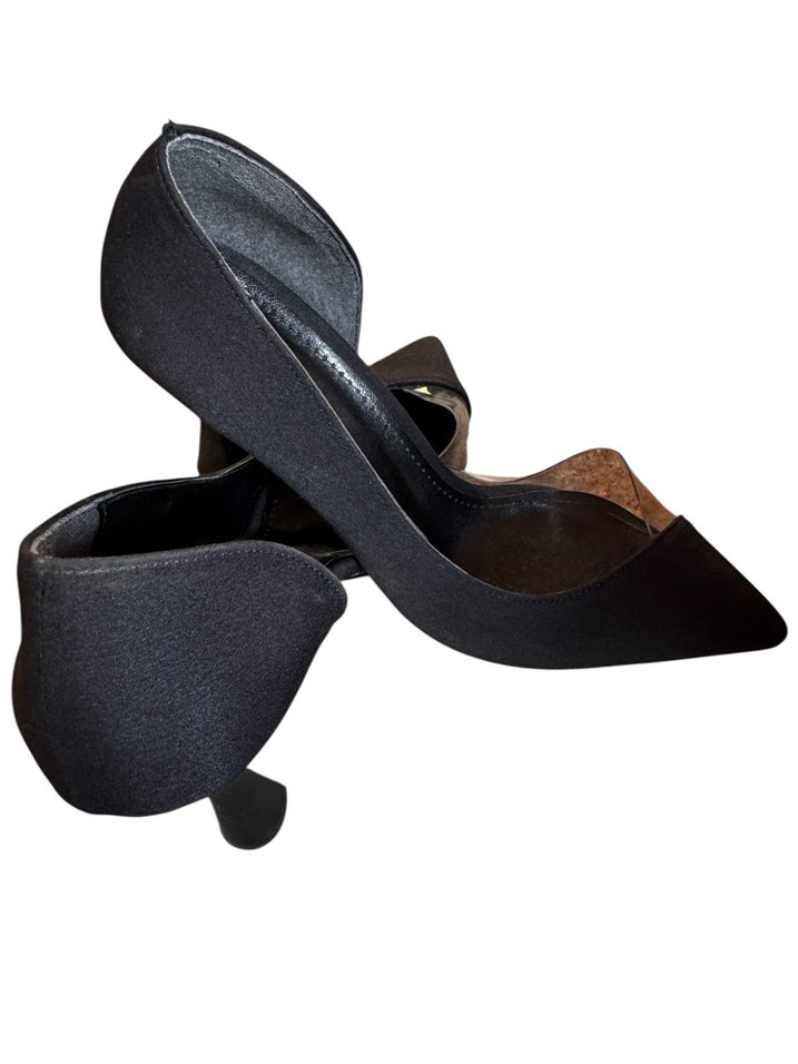 Siyah kadın stilettolar, dolgu topuklu ve tokalı detaylıdır. Kauçuk malzemeden yapılmış olup ofis kullanımı için uygundur.