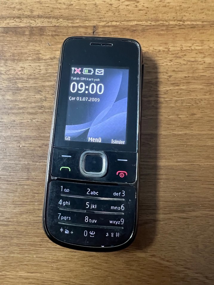 Tarih ve saat gösteren renkli ekranlı, sayısal tuş takımı ve temel navigasyon butonlarına sahip klasik siyah kaydırmalı telefon.
