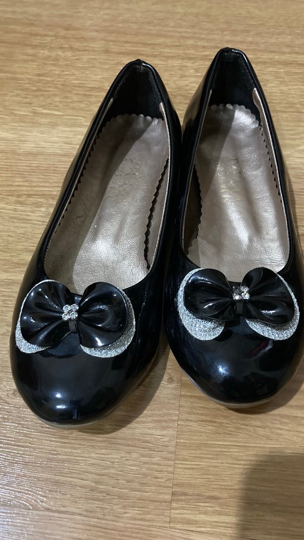 Lastik malzemeden yapılmış siyah kız babet ayakkabılar, fiyonk detayıyla gotik ve klasik zarafeti bir arada sunar.