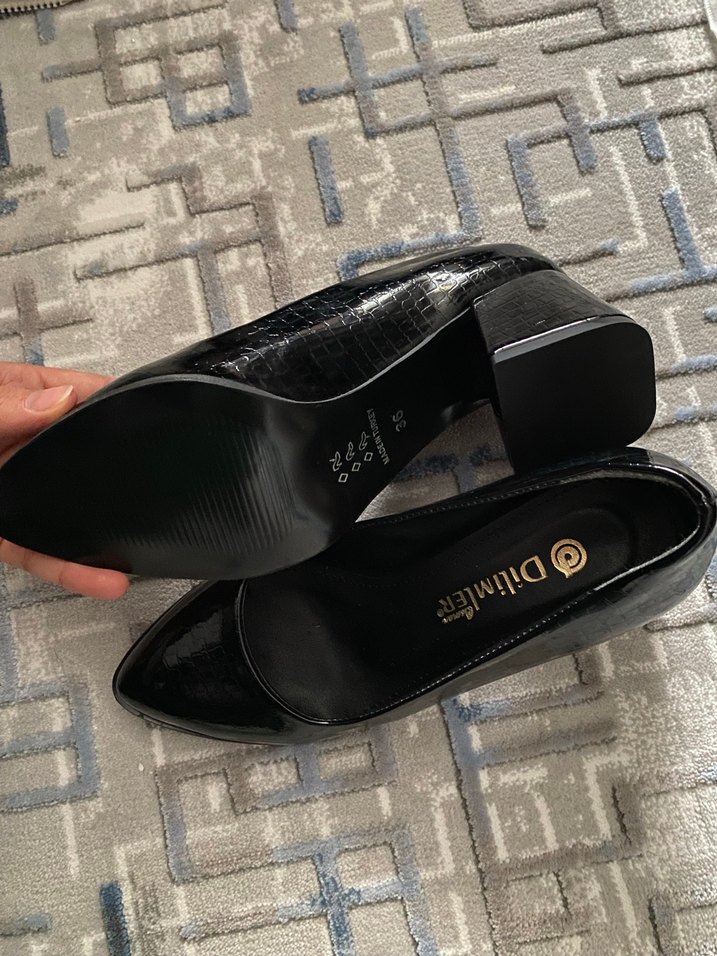 Siyah kroko desenli kadın klasik ayakkabılar, blok topuklu ve lastik malzemeden. Tokalı detaylı, günlük iş kullanımı için uygun.