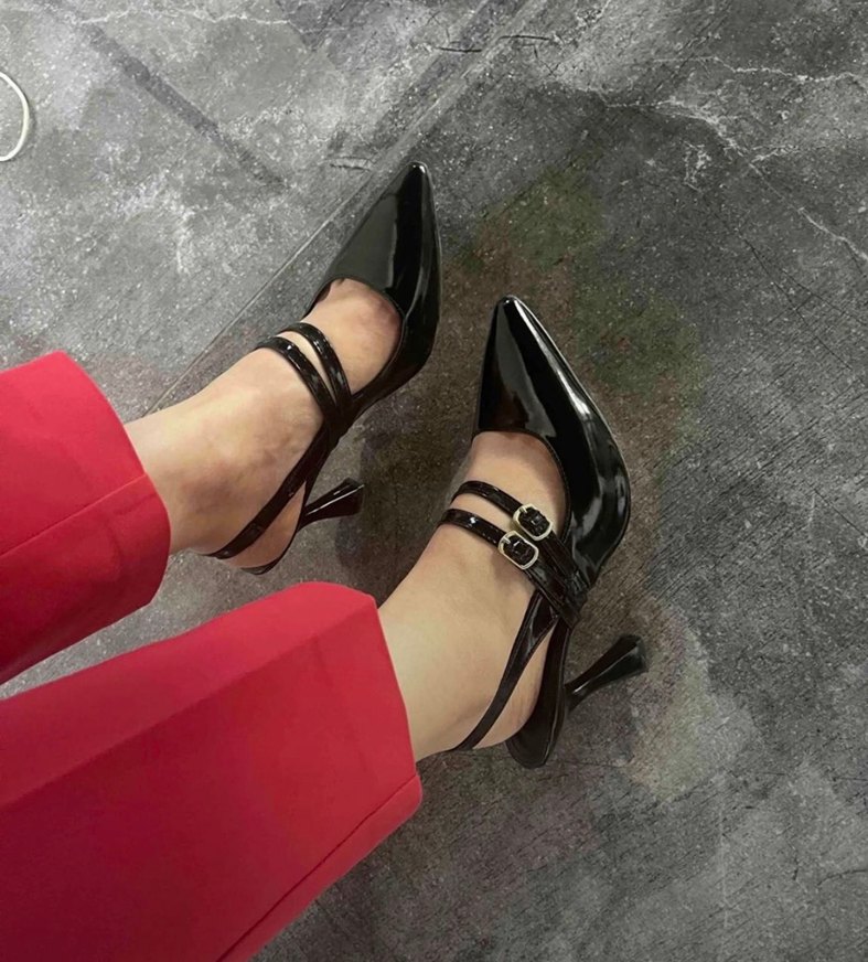 Siyah krokodil desenli, çift tokalı stiletto topuklu ayakkabı, kauçuk malzemeden yapılmış, cesur ve çağdaş bir tasarım.