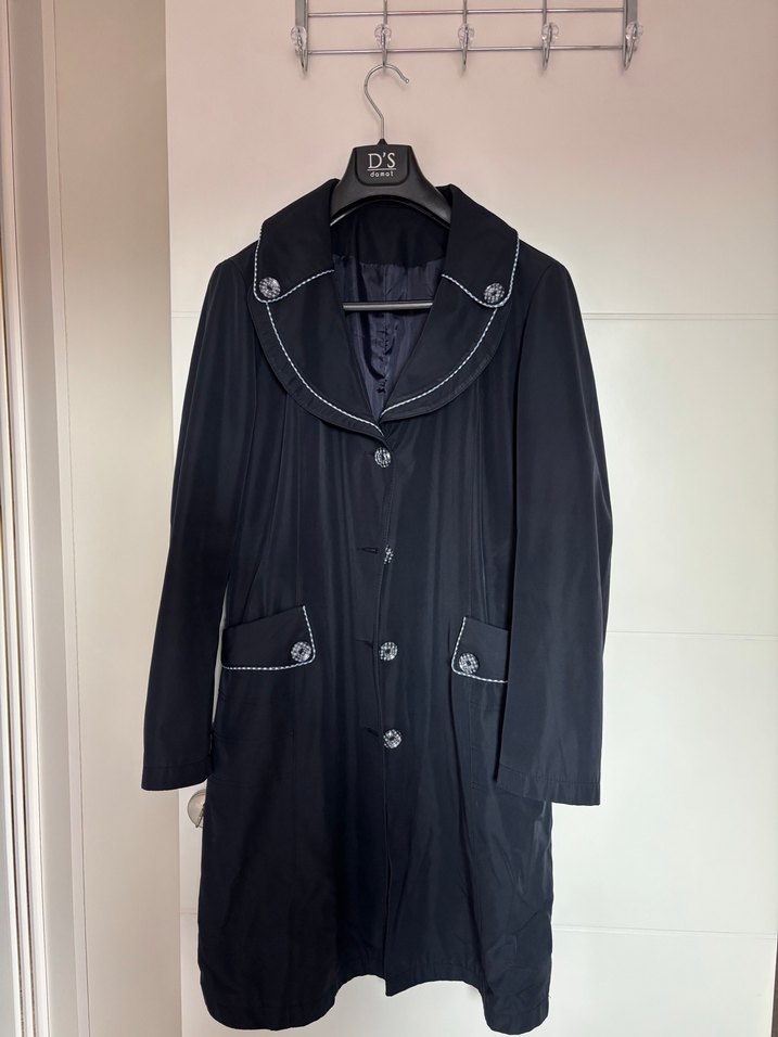 Siyah midi yağmurluk, keskin yakalı ve düğmeli ön detaylı, ipeksi kumaş, uzun kollu ve günlük kullanım için rahat kesim.