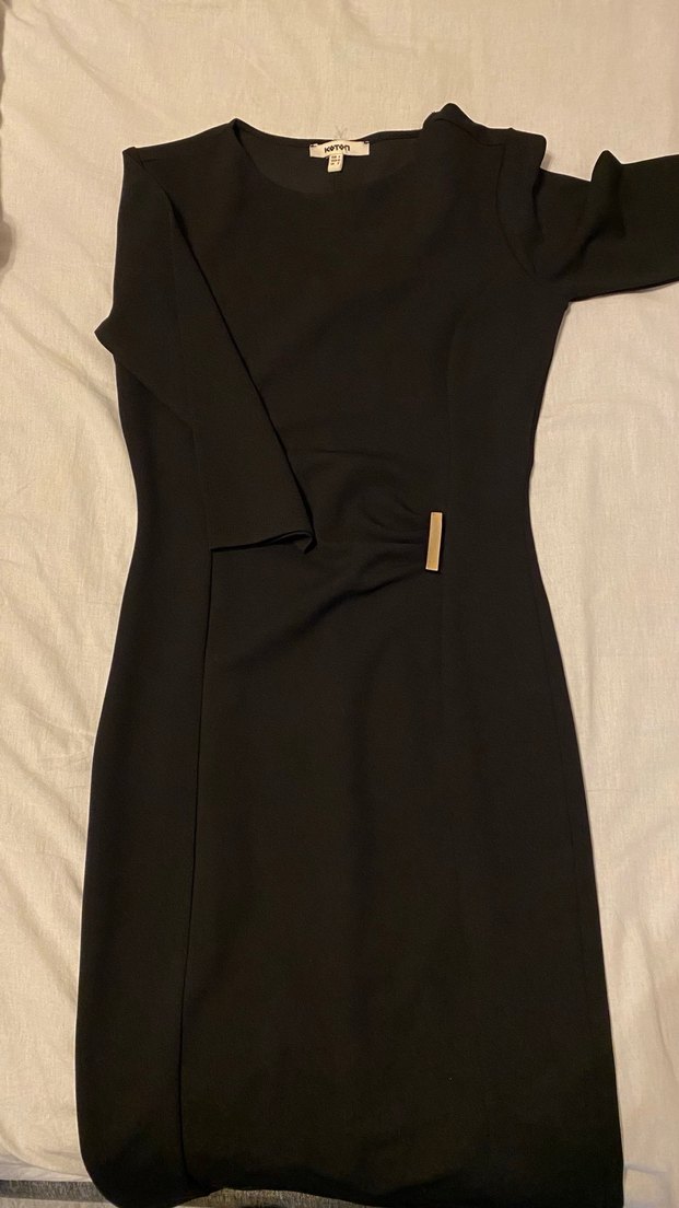 Bu siyah midi elbise, oturtmalı kesim, yakalı ve kemerli bel detayına sahiptir. Yarım kollu, modern klasik tarzda ofis için uygundur.