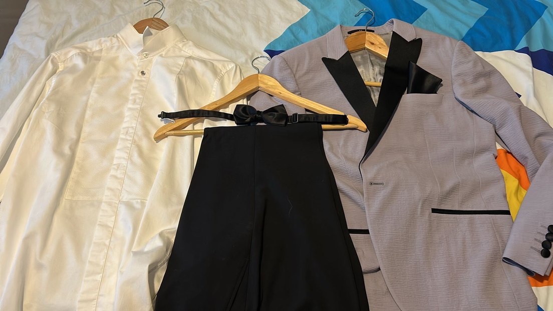 Düğmeli yakalı, askılı kollu ve fiyonk detaylı siyah midi smokin. Klasik gotik tarzda, normal kesim, düğünler için uygun.