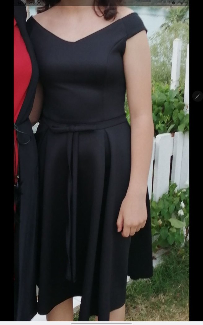 emir ela siyah elbise V yaka, askılı kollu, kemerli ve klasik gotik şıklıkta siyah midi elbise, düğünler için uygun.