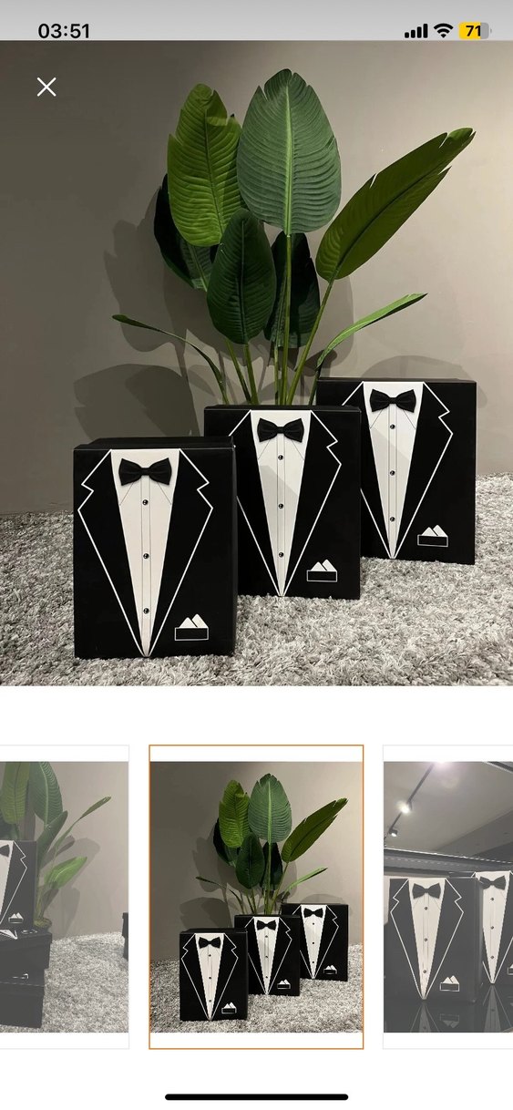 3 adet Modern klasik siyah tuxedo, desenli yakalı ve fiyonk detaylıdır. Regular fit olup kısa, askılı kollara sahiptir, düğünler için uygundur.