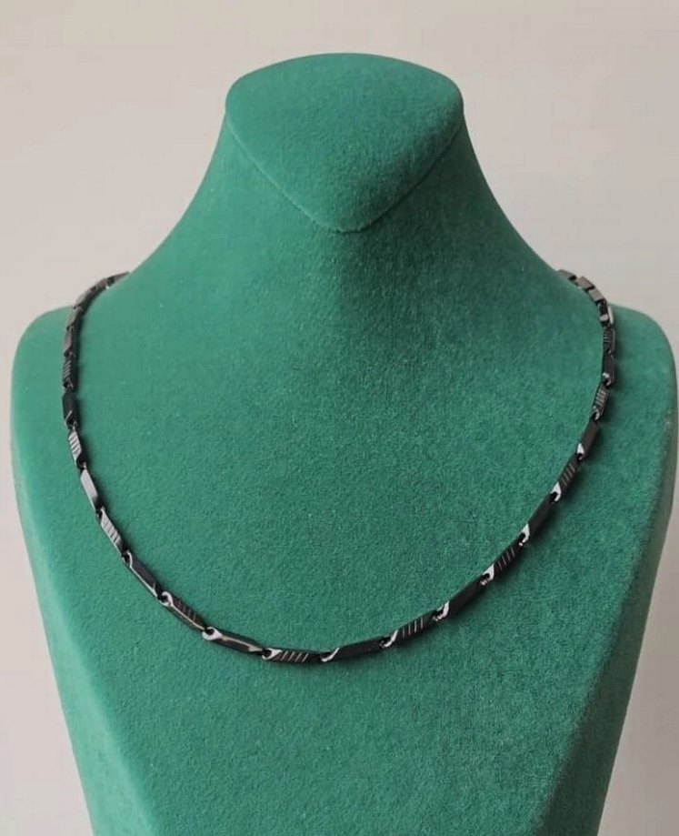 Siyah erkek kolye, çağdaş minimalist tasarımı ve ince desenli halkalarıyla klasik şıklık sunar. Çelik