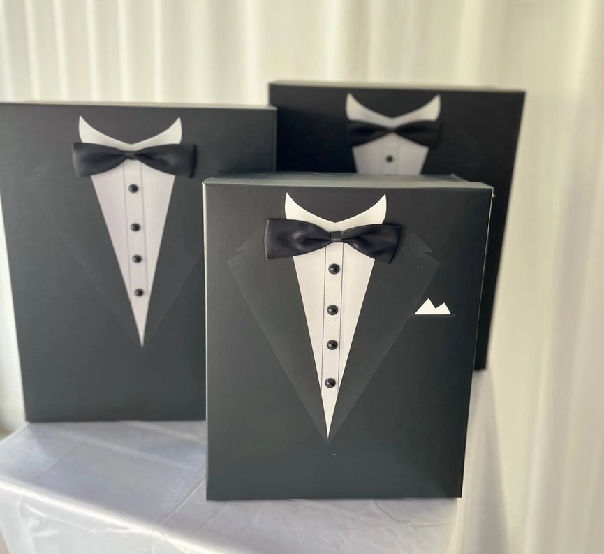 Düğünler için papyon ve klasik yakalı baskılı modern siyah damatlık kutusu.