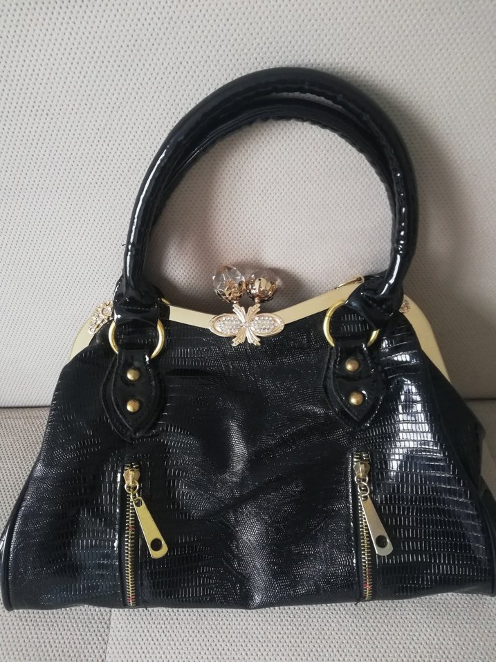 Parlak siyah deri, yılan desenli ve tokalı detaylara sahip kadın çantası. Klasik zarafeti gotik stil ile birleştirir, günlük kullanım için uygun. marka temsili