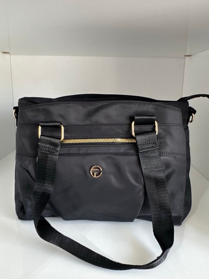 Parlak siyah sentetik kumaştan, tokalı askıları olan klasik şıklıkta bir kadın omuz çantası. Desensiz, günlük ve sokak tarzına uygun.