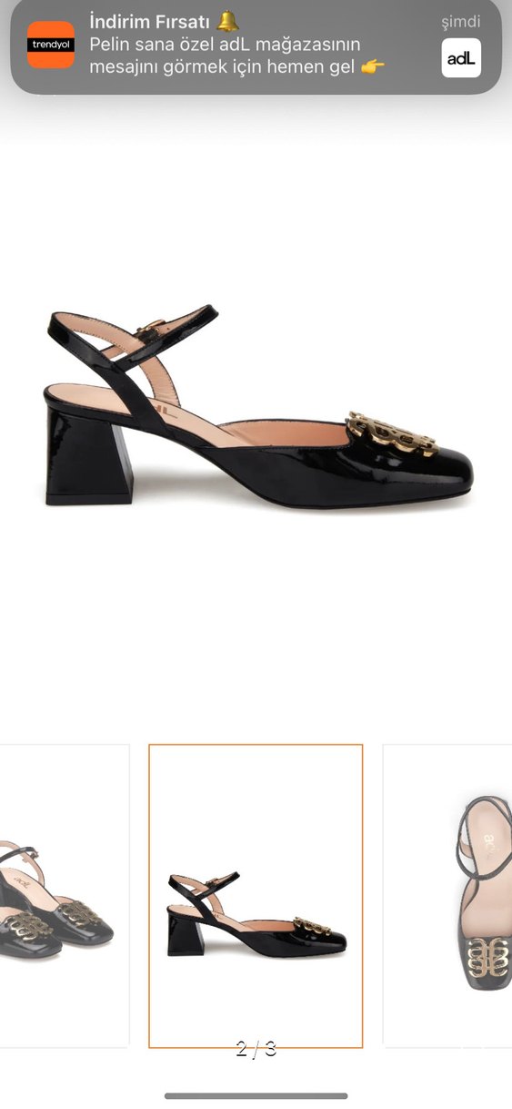 Siyah parlak yüzeyli, tokalı ve kalın topuklu kadın ayakkabısı. Yılan derisi desenli ve kauçuk malzemeden üretilmiştir. Ofis için uygundur.