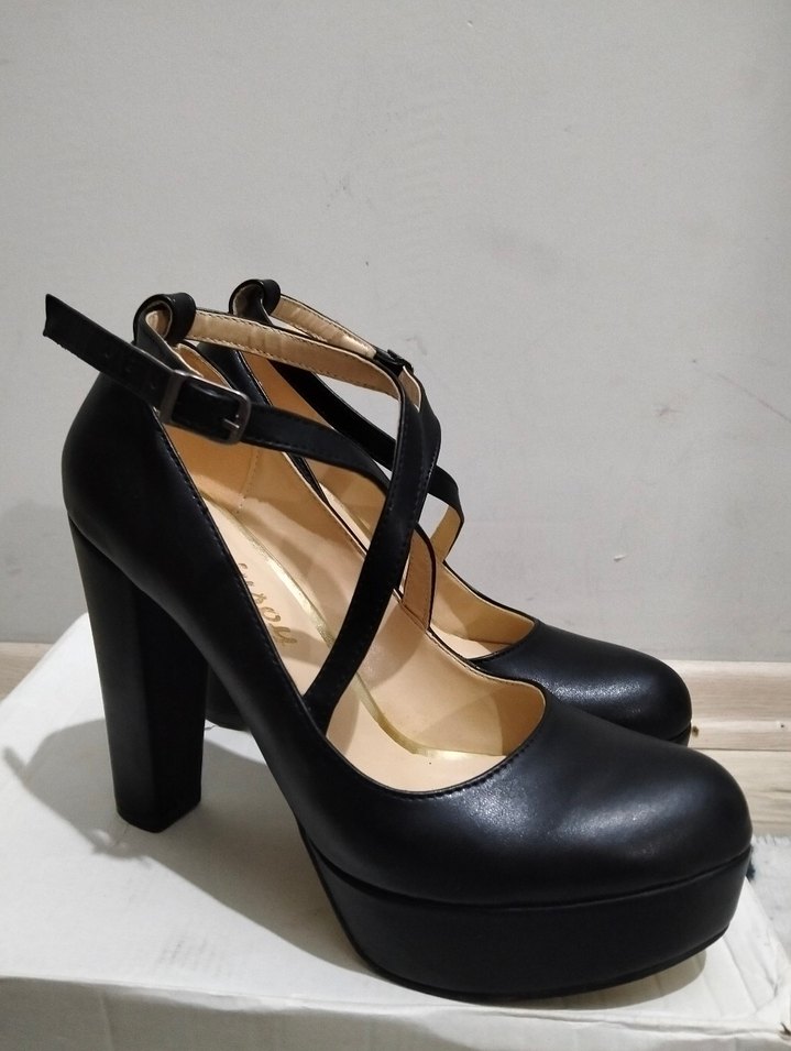 Kauçuk malzemeden yapılmış, tokalı bantlı siyah platform topuklu kadın gece ayakkabısı, klasik gotik tarzıyla ofise uygundur.