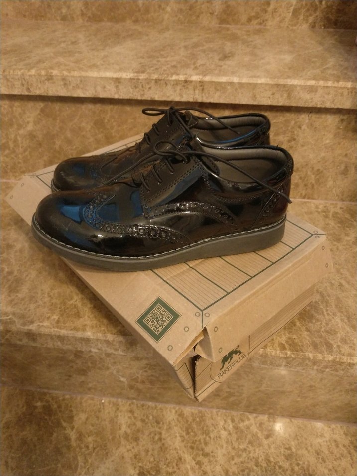 Parlak kauçuk malzemeden yapılmış, tokalı siyah klasik ayakkabılar. Gotik tarzda ve desensizdir. bir kere sünnet te giyildi
