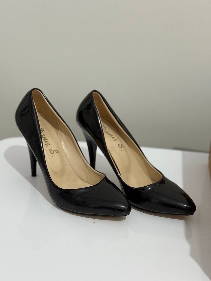 Kadınlar için parlak siyah rugan stiletto, yılan deseni ve modern klasik tasarıma sahip, ofis kullanımı için uygun. Kauçuk malzeme dayanıklılık ve konfor sağlar.