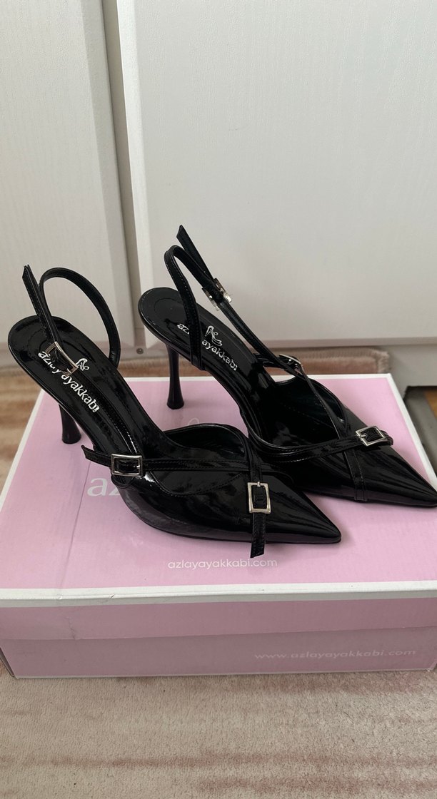 Siyah rugan malzemeden, tokalı ince topuklu ve sivri burunlu stiletto. Bir sorunu yoktur ihtiyaç fazlası olduğundan dolayı satılıktır