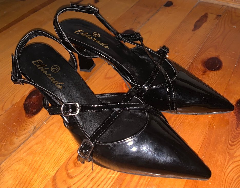 Klasik zarafette, tokalı bantlı siyah rugan kadın topuklu ayakkabılar. Baskılı desenli, romantik akşamlar için uygun.