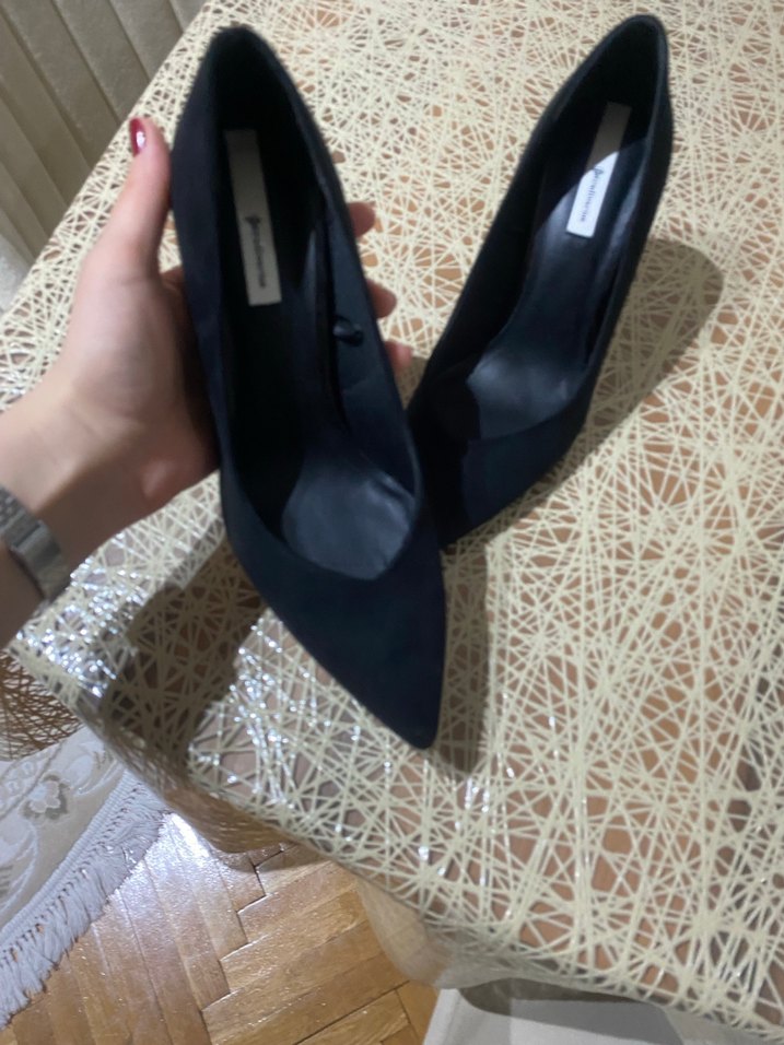 Siyah, tokalı stiletto topuklu ayakkabılar, kauçuk malzemeden. Klasik ve şık bir ofis görünümü için baskılı desende.