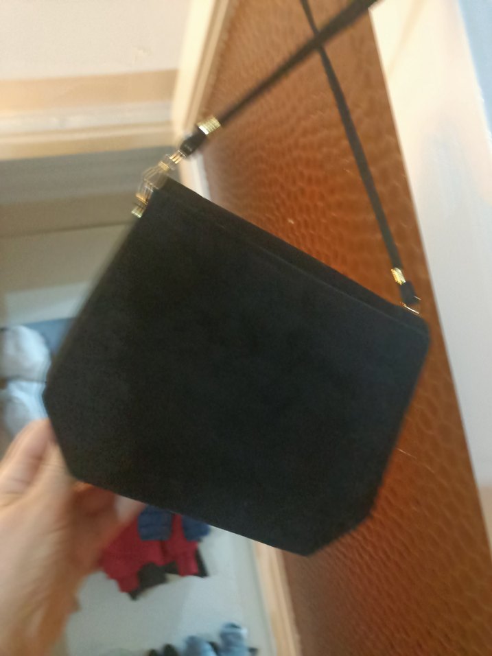 Siyah süet kadın çanta, tokalı tasarımı ve şık, çağdaş stiliyle dikkat çekiyor. Desensiz yüzeyi klasik zarafet sunar, günlük kullanım için uygundur.