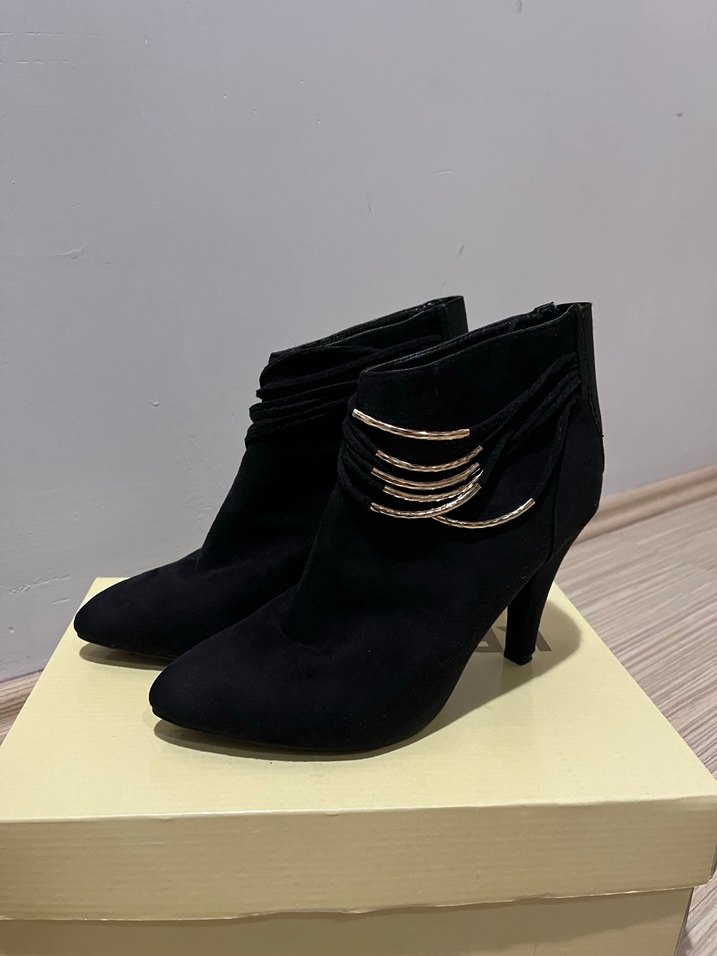 Siyah süet malzemeden yapılmış, stiletto topuklu ve altın püsküllü. Romantik akşamlar için klasik şıklık sunar.