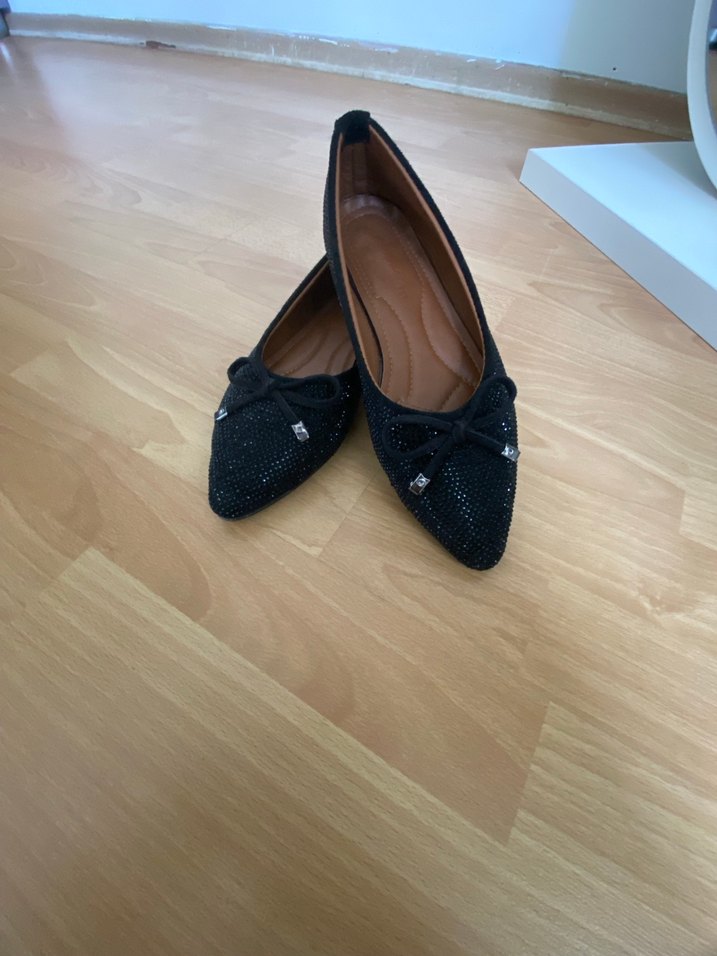 Siyah, taşlı ve tokalı detaylı, minimalist, ofis için uygun kadın babetler.