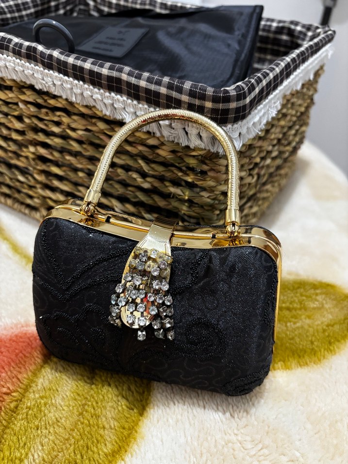 Siyah kadın portföy çanta, altın renkli sap ve taşlı tokasıyla düğünler için modern klasik tarz sunar. ✨