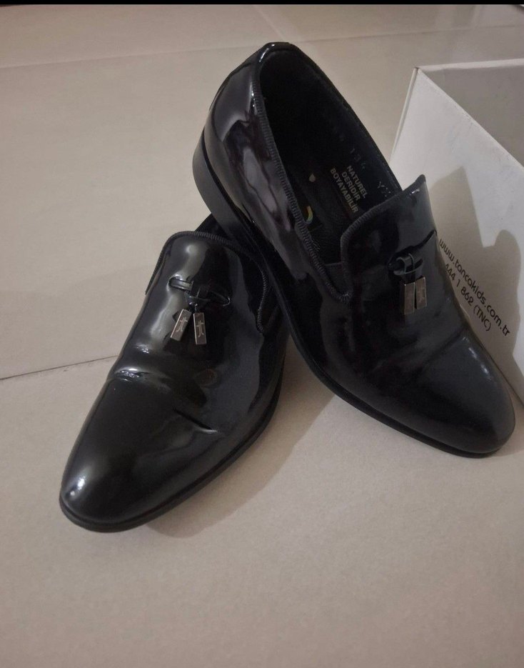 Hakiki deri malzemeden yapılmış, tokalı, desen içermeyen siyah klasik erkek ayakkabısı. Mezuniyet için uygun şık model.