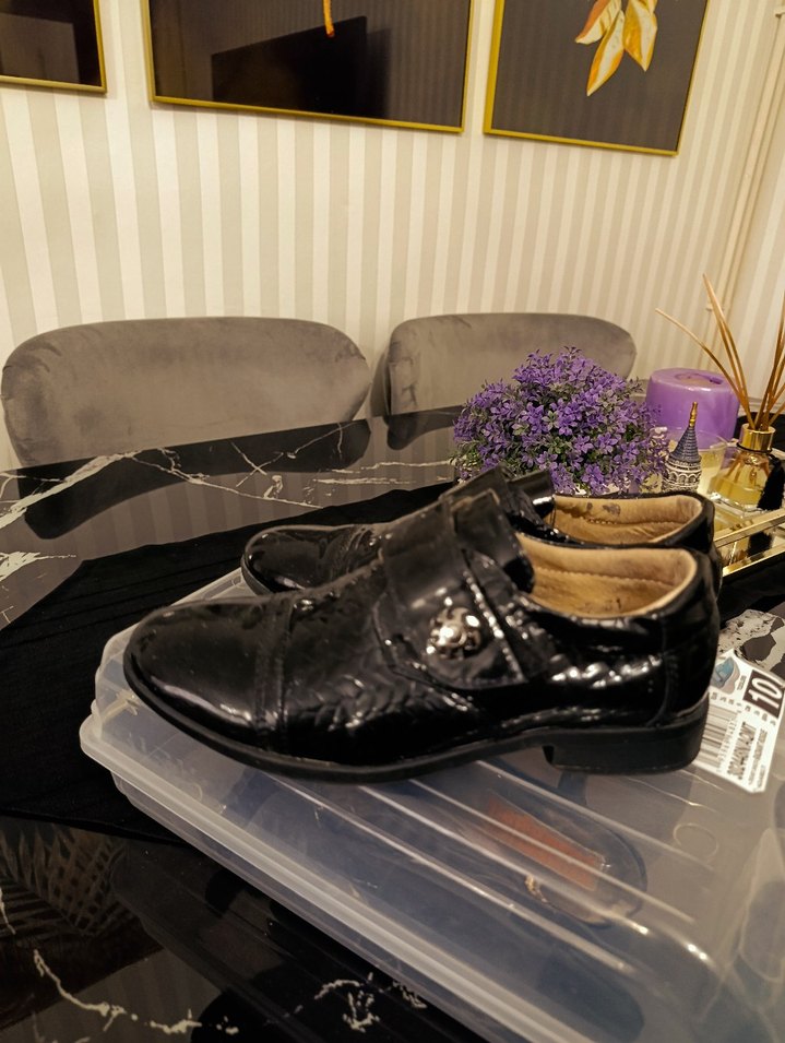 Klasik siyah tokalı erkek ayakkabısı, kauçuk malzemeden üretilmiş, ofis kullanımı için uygundur ve gotik tarzı yansıtır. 31 numara 5,6 defa düğünde kullanıldı