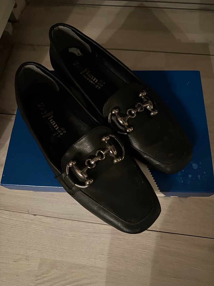 Klasik siyah kadın ayakkabısı, tokalı ve kalın topukludur. Kauçuk malzemeden yapılmış, desen içermeyen bu ayakkabı ofis için uygundur.