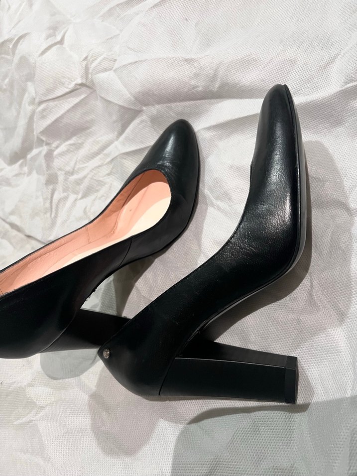 Siyah kadın topuklu ayakkabılar, blok topuklu ve tokalı detaylıdır. Düz, desensiz kauçuk malzemeden yapılmış olup, klasik ve çağdaş Paris tarzını yansıtır, ofis için uygundur.