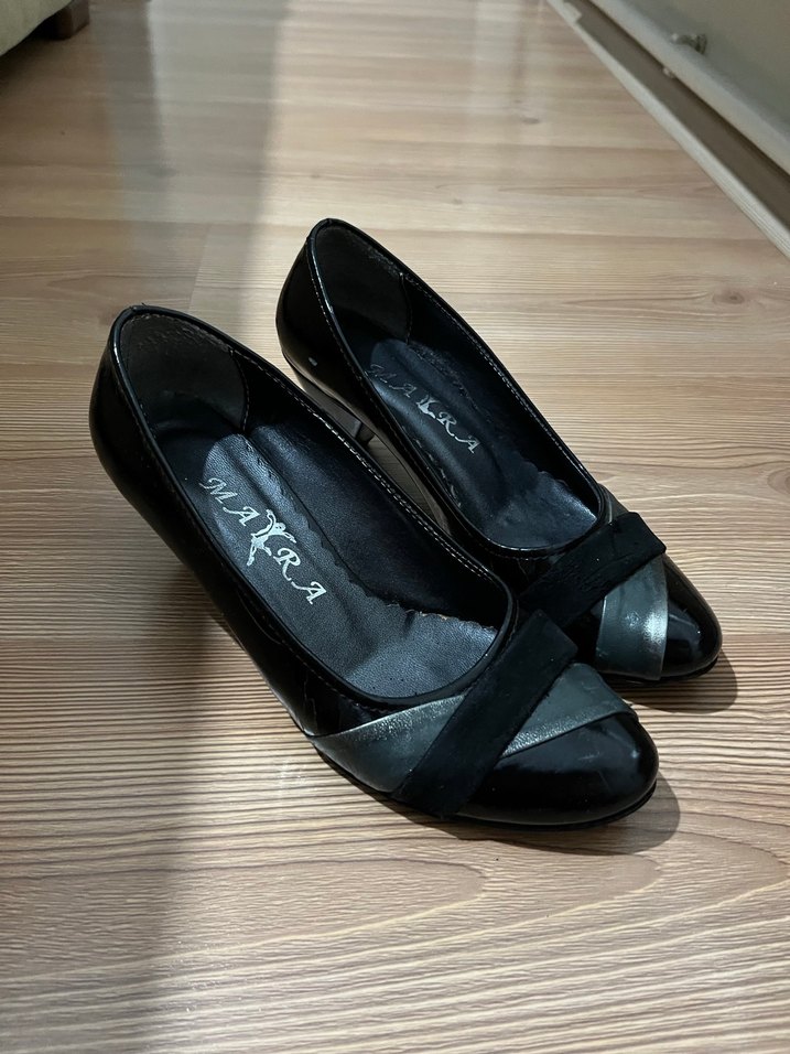 Klasik şıklık ve gotik tarzı bir araya getiren, tokalı siyah kadın topuklu ayakkabılar. Kauçuk malzemeden ve blok topuklu, ofis için uygun.