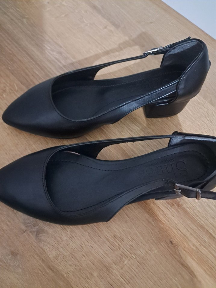 Klasik zarafette, tokalı siyah kadın topuklu ayakkabılar, minimalist gotik stilde blok topuklu ve desenizdir. Ofis kullanımı için uygundur.
