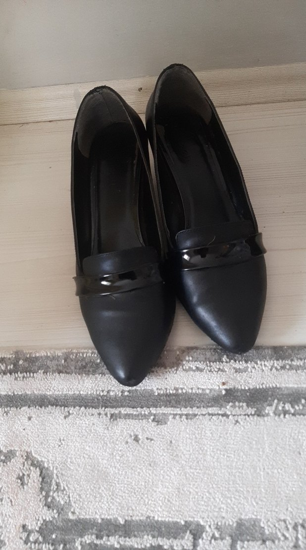 Siyah, tokalı bant detaylı kadın babetler. Lastik malzemeden, blok topuklu ve ofis kullanımı için uygun minimalist gotik tarzda.