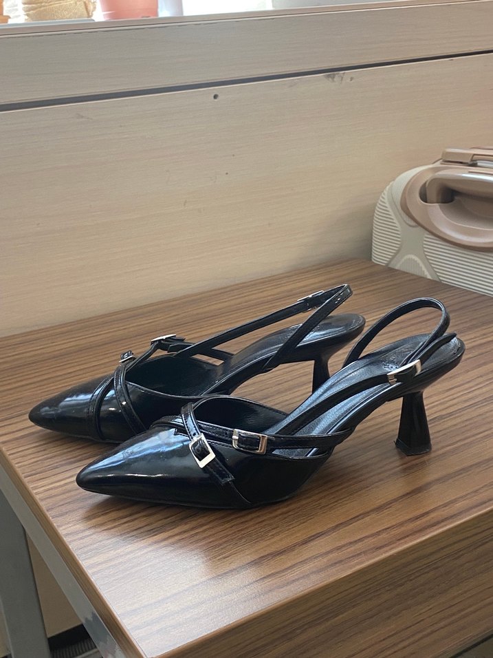 Siyah, tokalı bantlı stiletto topuklu ayakkabı, sivri burun ve parlak yüzeye sahip. Ofis için klasik ve gotik tarzda uygun.