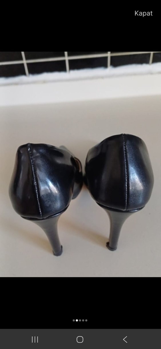Siyah tokalı, kauçuk malzemeden klasik goth tarzında stiletto topuklu kadın ayakkabısı, ofis kullanımı için uygundur. Desensiz ve şık görünüm sunar.