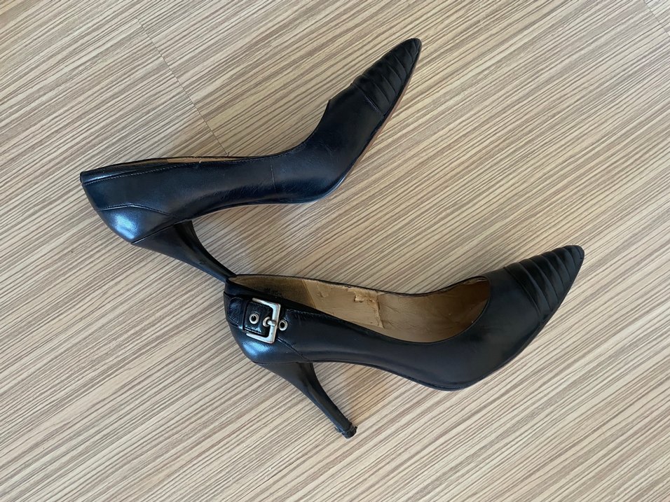 Hakiki deri, tokalı ve yılan derisi desenli siyah stiletto topuklu ayakkabı. Ofis için klasik gotik tarzda uygun. İçinde dökülme var, topuğunda deforme var, topuk boyu 10 cm. 39 M numara