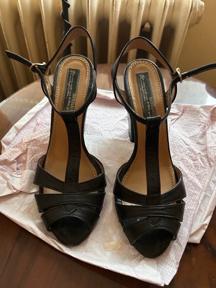 Siyah, tokalı bantlı yüksek topuklu kadın ayakkabısı. Klasik ve gotik tarzda, desen içermeyen, romantik akşamlar için uygun. Dans ayakkabısı olarak kullanılabilir