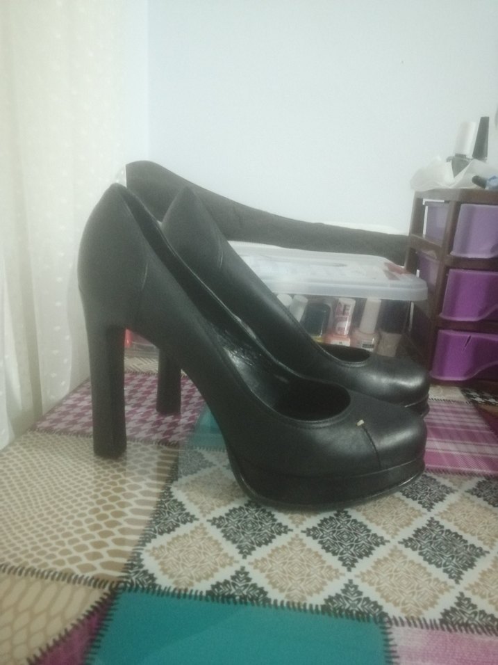 Siyah tokalı, kauçuk malzemeden blok topuklu klasik ve gotik tarzda kadın ayakkabısı. Desensiz, ofis için uygun.