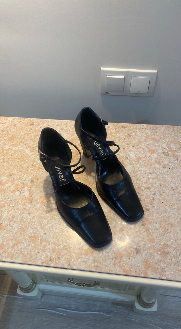 Siyah tokalı, kauçuk malzemeden yapılmış blok topuklu kadın ayakkabısı. Desensiz, gotik tarzda ve klasik zarafette, ofis için uygundur.