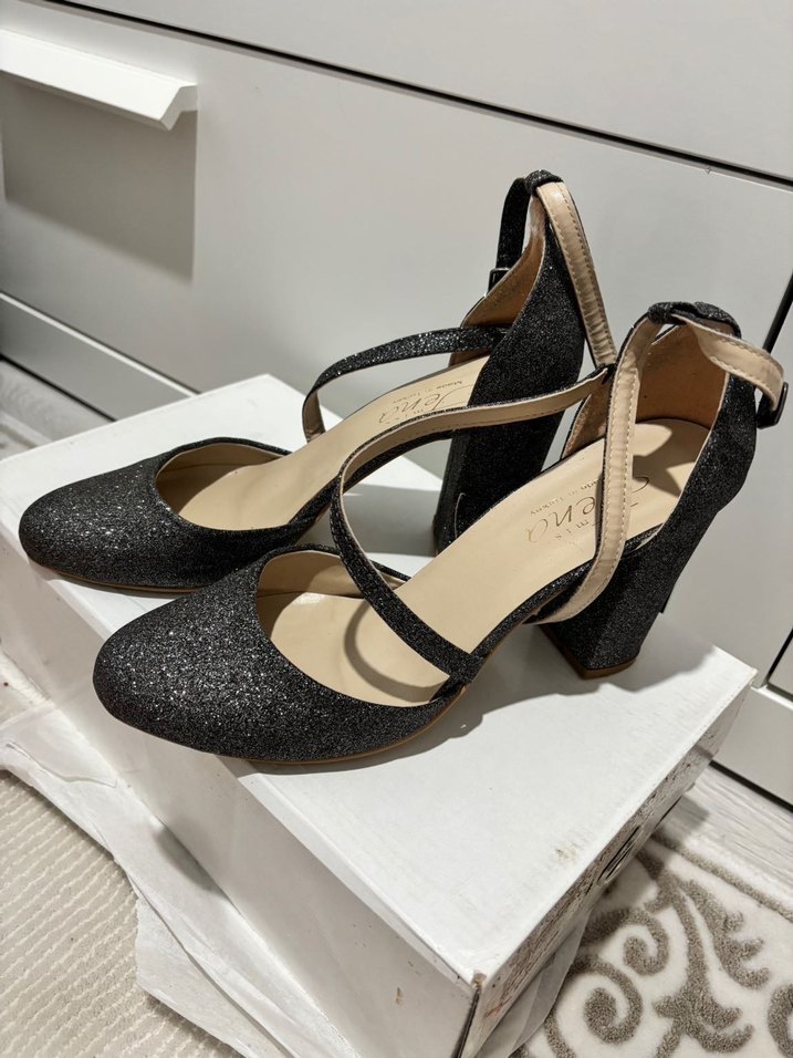 Siyah, tokalı bantlı, blok topuklu kadın ayakkabısı. Ofis kullanımı için uygun, parlak detaylı ve rahat tabanlıdır.