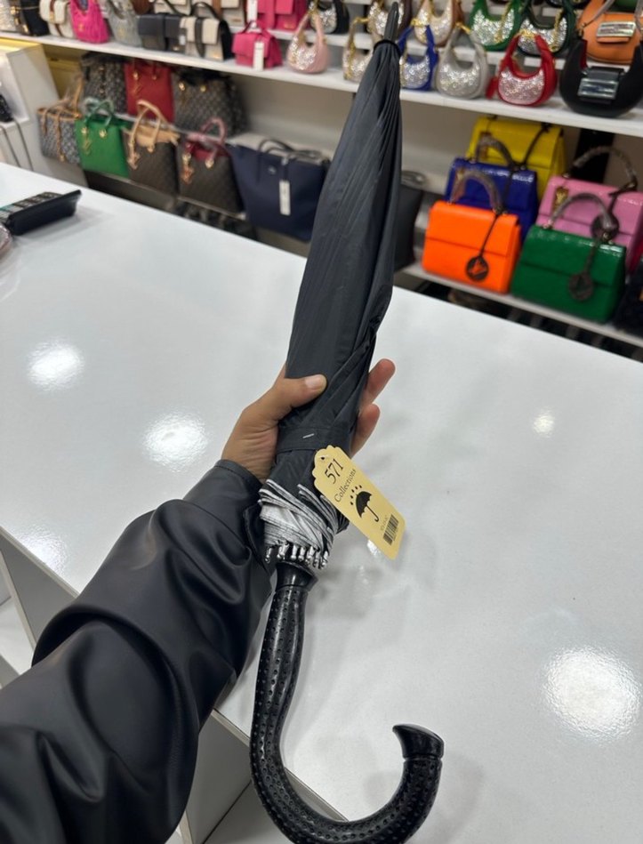 Siyah renkte, tokalı kayış ve kavisli saplı kadın şemsiye, klasik zarafet ile sokak modasını birleştirir. ☂️